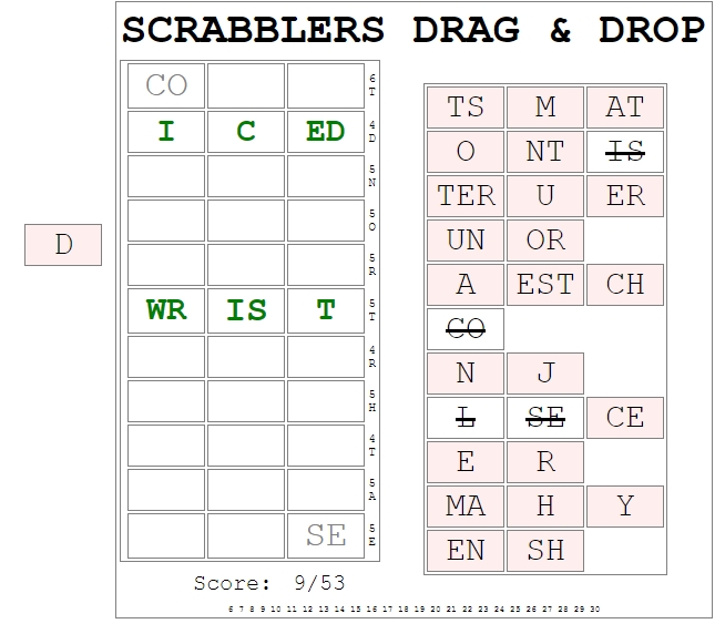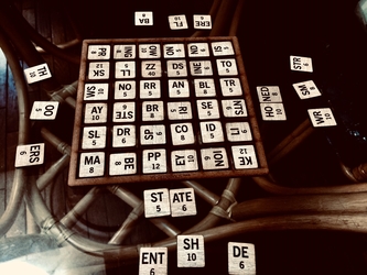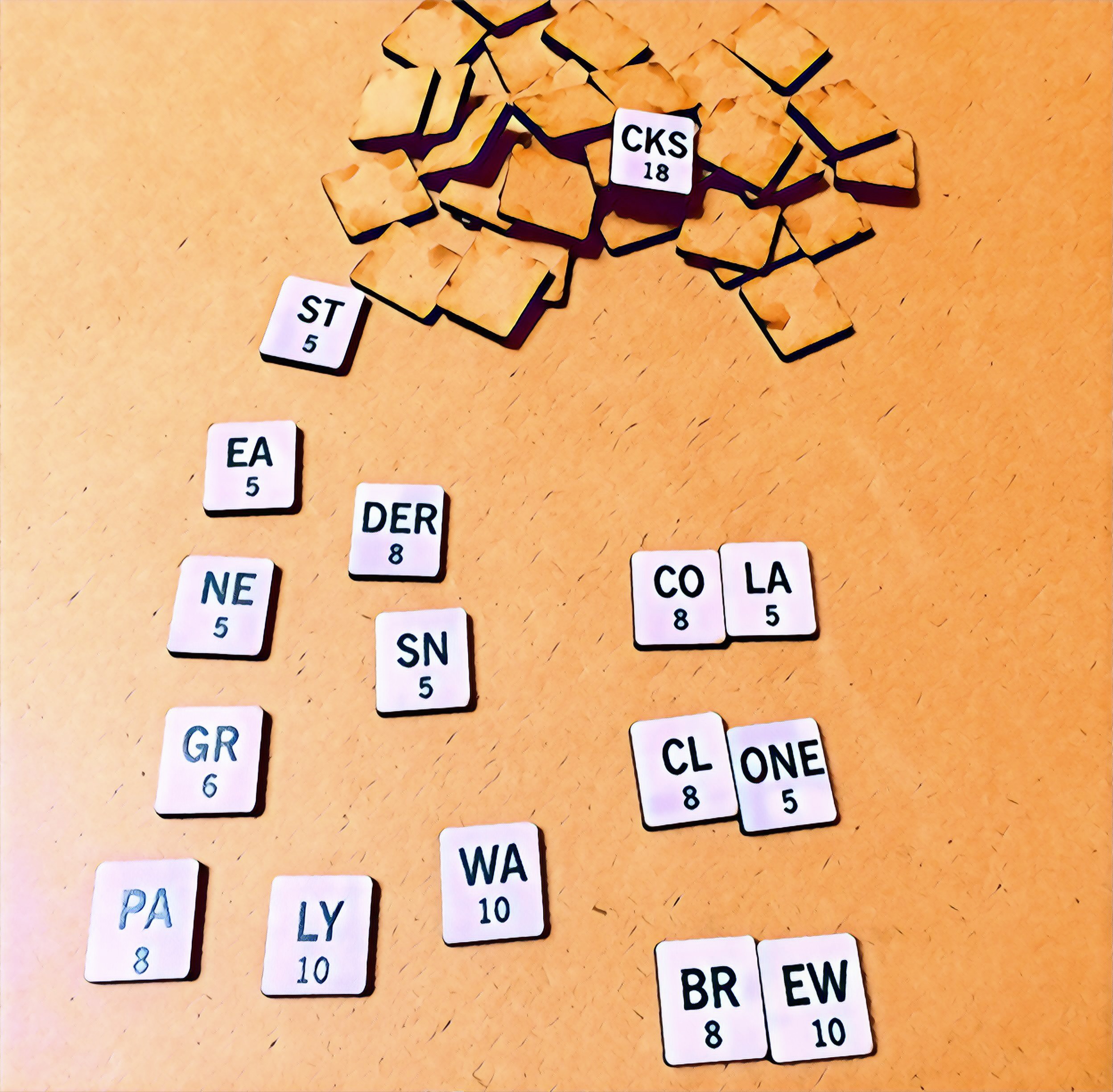 Scrabblers are unique lasercut bigram and trigram tiles for playing various new word games including "Stackers".