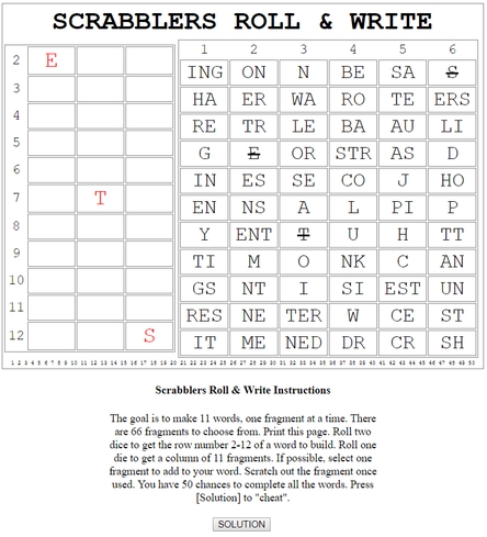A free printable solitaire Scrabblers game. Roll dice to place letters. Fill the grid to win.